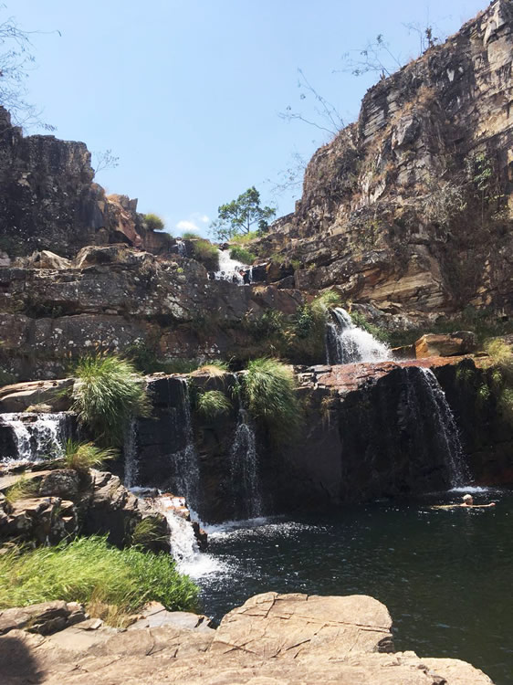 Cachoeira de águas transparentes, onde se encontra um bar flutuante.